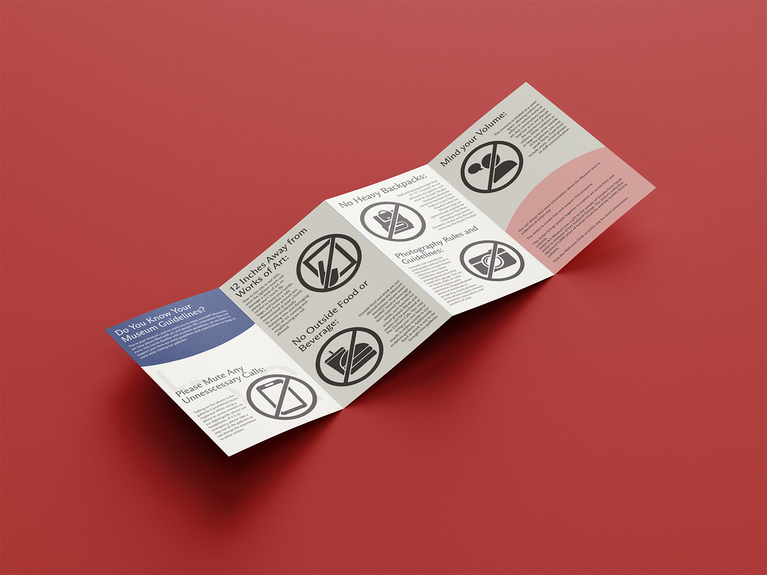 After working at the Joslyn, there was an issue of visitors skimming through the museum’s informational handouts. The handouts were text-heavy, and while design elements were present, there seemed not to be enough for visitors to understand the guidelines. This project aimed to redesign these handouts to make them more visually heavy.